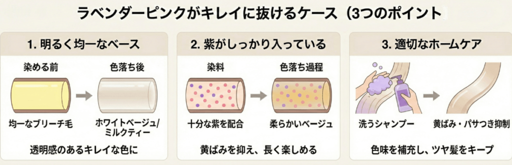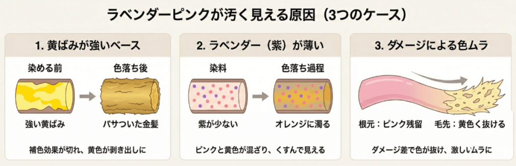 ラベンダーピンク自体が汚くなるというよりも、紫が抜けた後のベースが目立つことで濁って見えるケースが多いです。