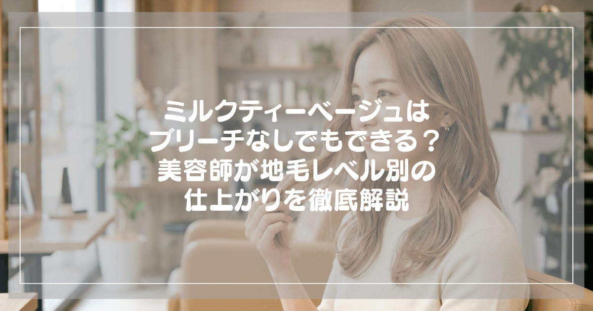 ミルクティーベージュには暗めタイプ(10〜12レベル)と明るめタイプ(13〜14レベル)の2つがあり、ブリーチなしでできるのは暗めタイプまでで、明るめタイプを狙うならブリーチ1回以上がほぼ必須です。