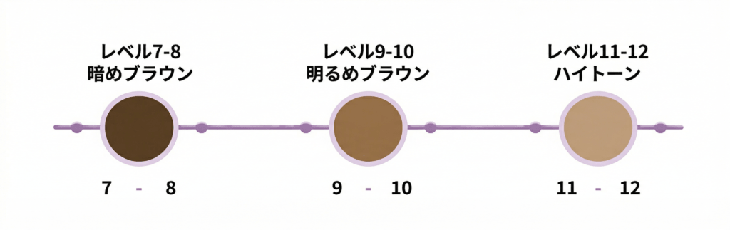 レベル9〜10の明るめブラウン → 黄ばみよりオレンジ・赤みが主体のレベル