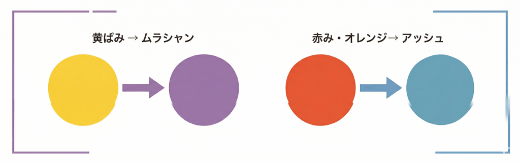 - 黄ばみ → ムラシャン、赤み・オレンジ → アッシュシャンプー