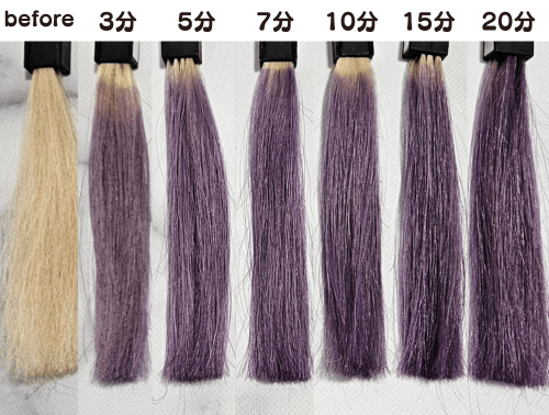さらに時間を置けばより濃く入るので、ハイトーンの黄ばみ消しから濃密なバイオレットカラーまで、放置時間で調整しやすいのが特徴です!