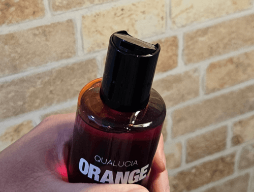 ボトルは透明なプラスチック製で、中のオレンジ色の液体が透けて見えるため残量がひと目でわかります。