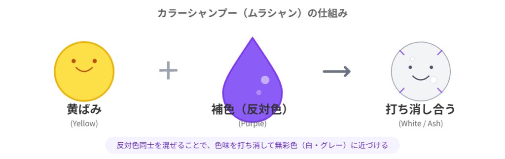 本来、紫は黄色の反対色(補色)にあたるため、通常のムラサキシャンプーは色同士が打ち消し合って色がはっきりとは出にくいのが一般的です。