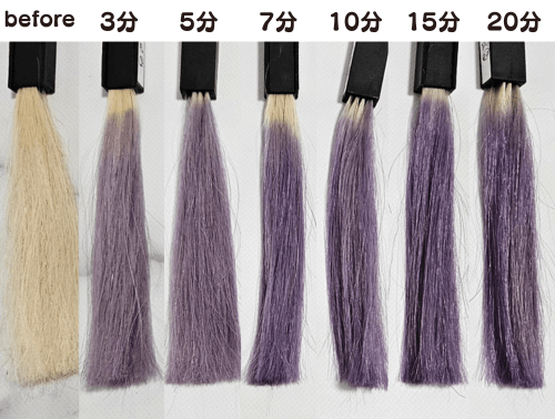 検証画像のように、3〜5分なら黄ばみを飛ばしてほんのりムラサキを感じる「淡いラベンダー系」に。