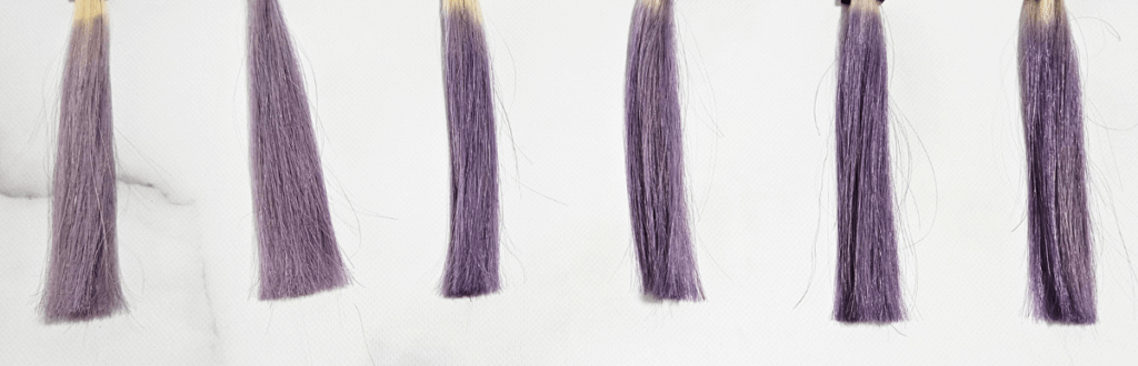 - ハイトーンのブリーチ毛では鮮やかな紫が出るため、ホワイト系にするなら放置時間の調整が重要