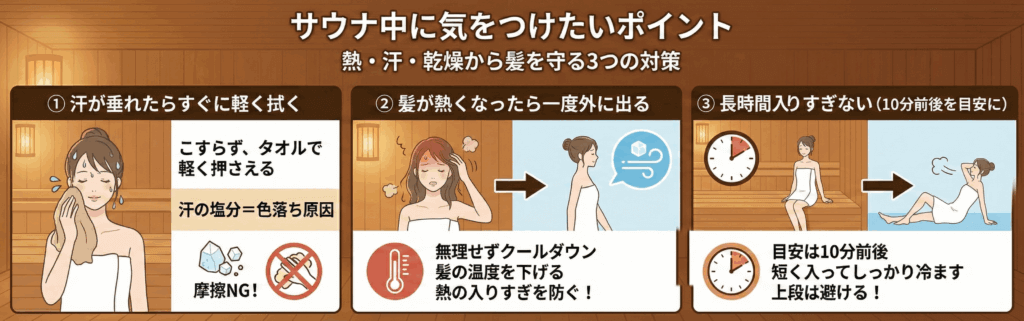 ここでは退色しやすいサウナ中の3つの対策方法を、読みやすく整理して解説します!