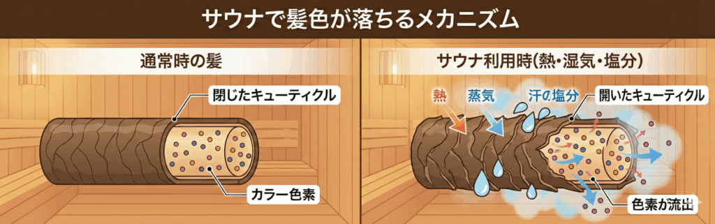 サウナの高温環境では髪の内部が膨張し、キューティクルが開きやすくなります。